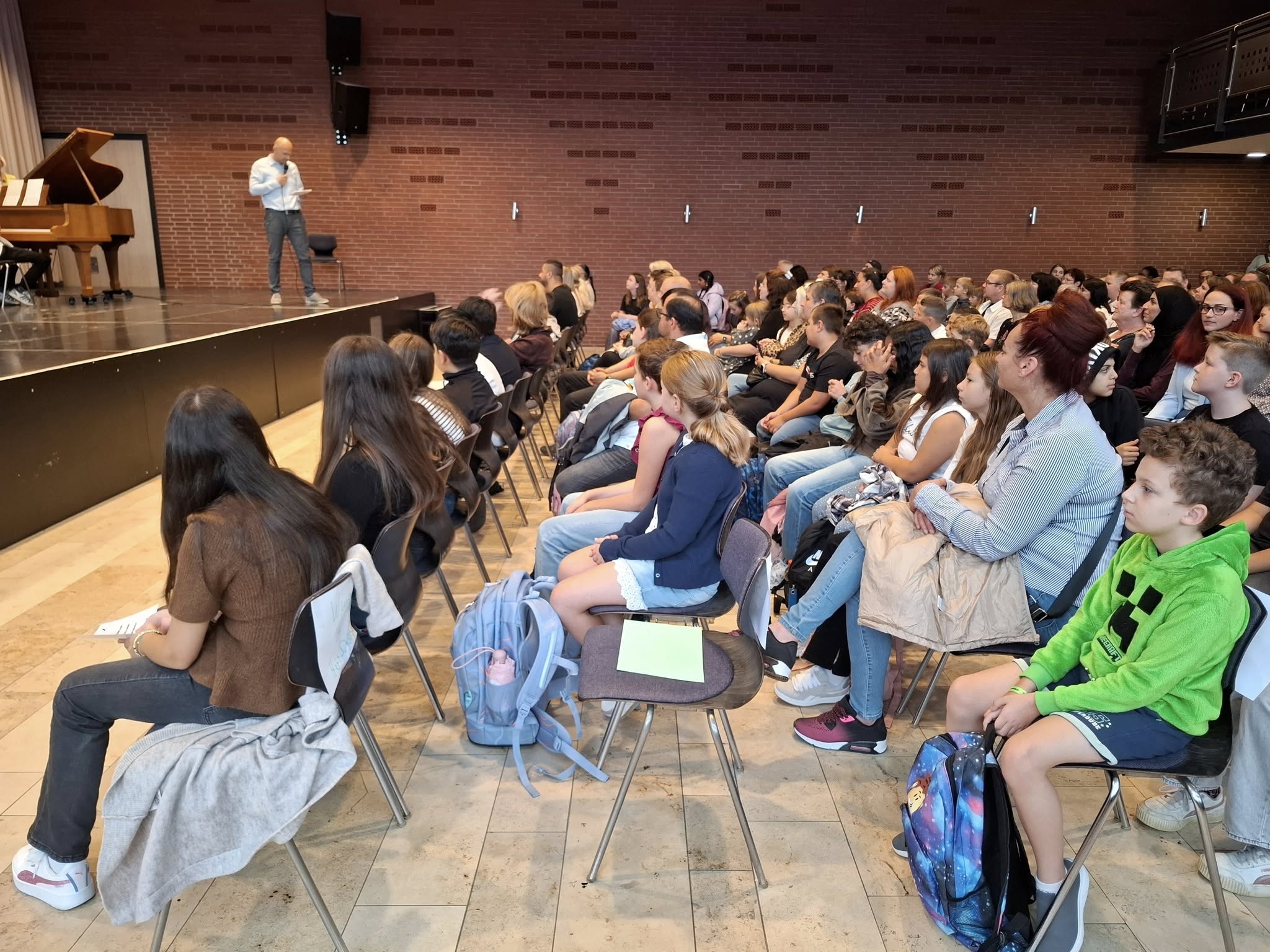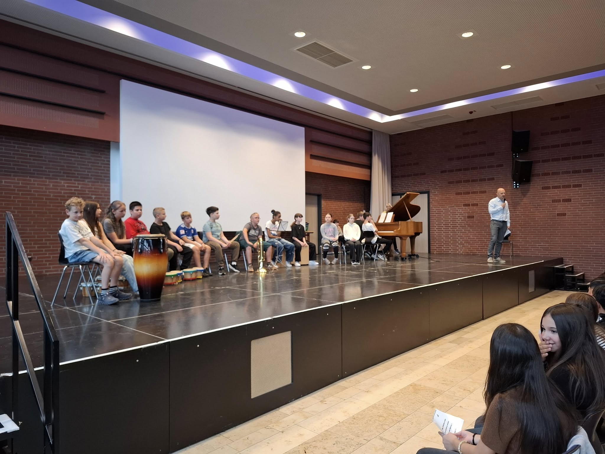 Nach dem musikalischen Auftakt durch die Rhythmus-AG unter Leitung von Frau Schwaner und einem Euphonium-Solo von Noah (7c) begrüßte Schulleiter Herr Stasch die Kinder und ihre Eltern. Schülerinnen und Schüler der sechsten Klassen überbrachten gute Wünsche, bevor Alexander (9a) mit einem Klavierstück aus Die fabelhafte Welt der Amélie für Gänsehaut sorgte.